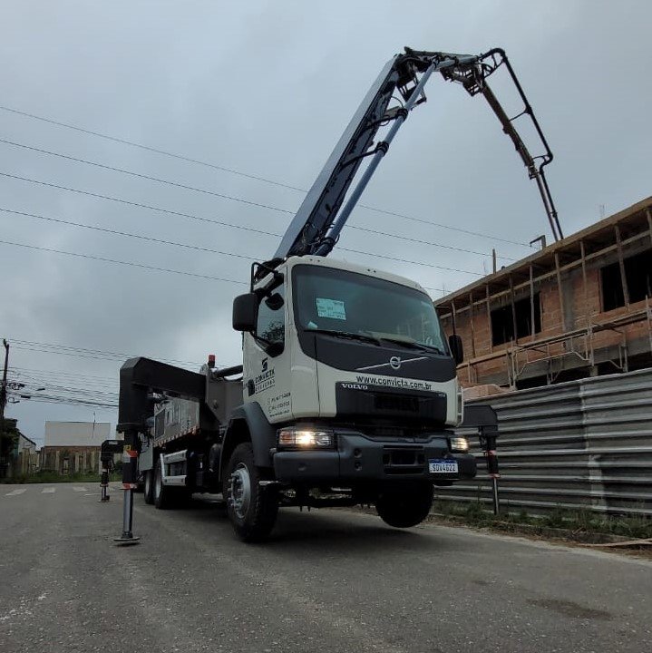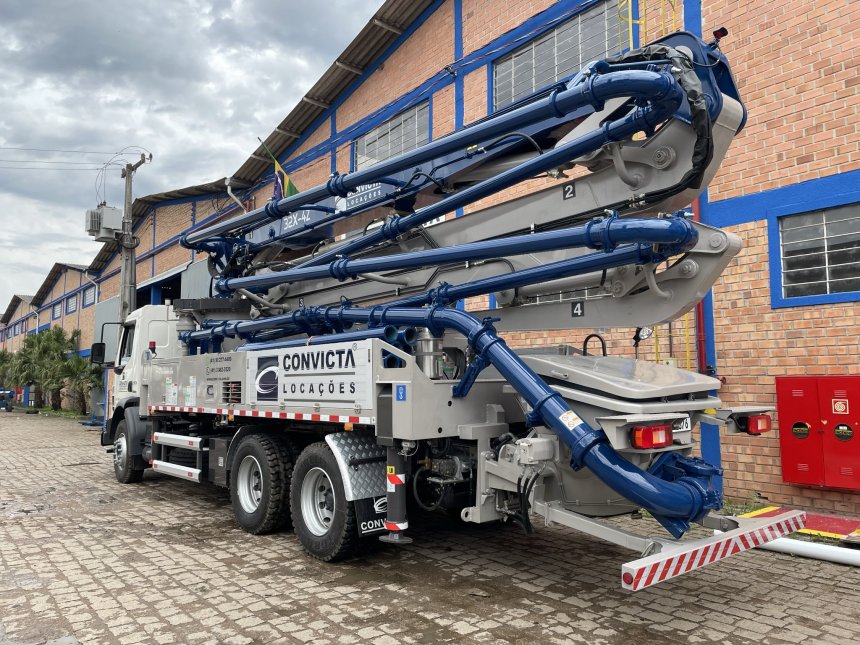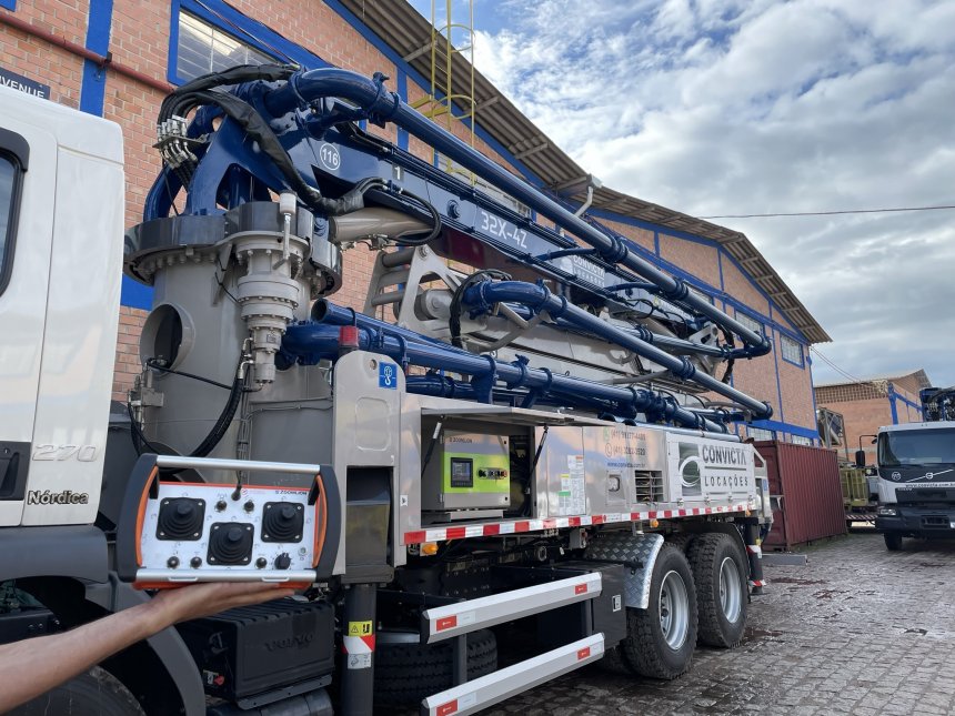 ● Bomba de concreto com alcance de até 32 metros para montagem em caminhão de 3 eixos